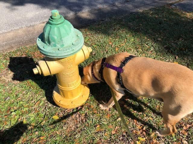 He sniffs all the trees and bushes along the path for peemail messages left for him by neighborhood friends he’s rarely if ever met in person.